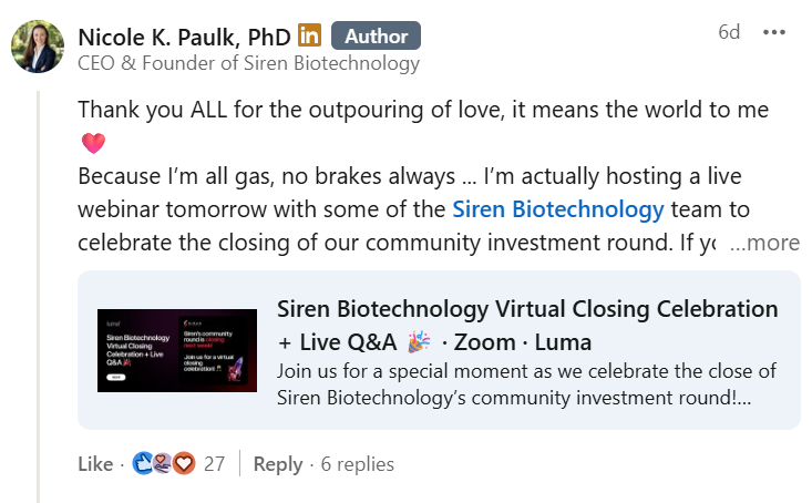 1,626 people just invested $4.2M in Nicole Paulk and her Siren Biotechnology team, to try to cure cancer. Never have I been more proud to work for Wefunder.