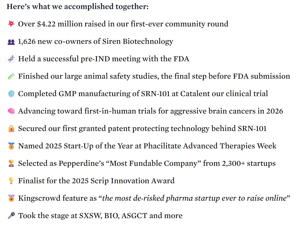 Last week, Siren Biotechnology concluded their Wefunder community round. They raised $4.2M from 1,626 investors.