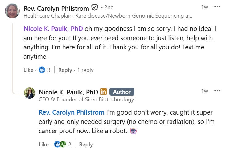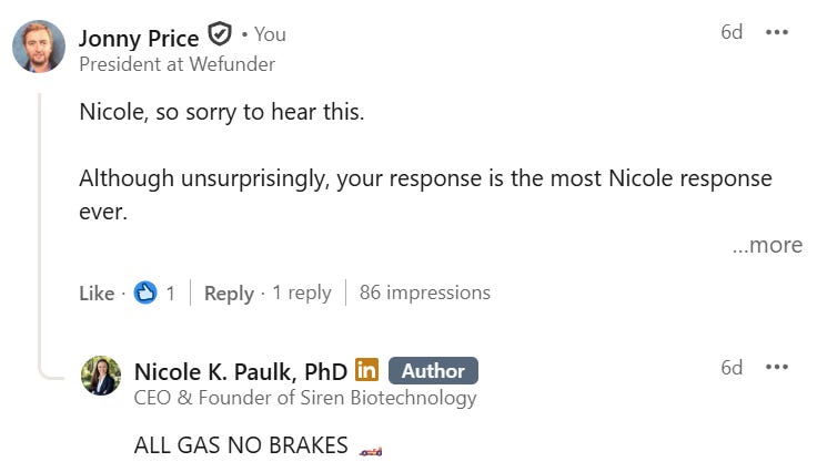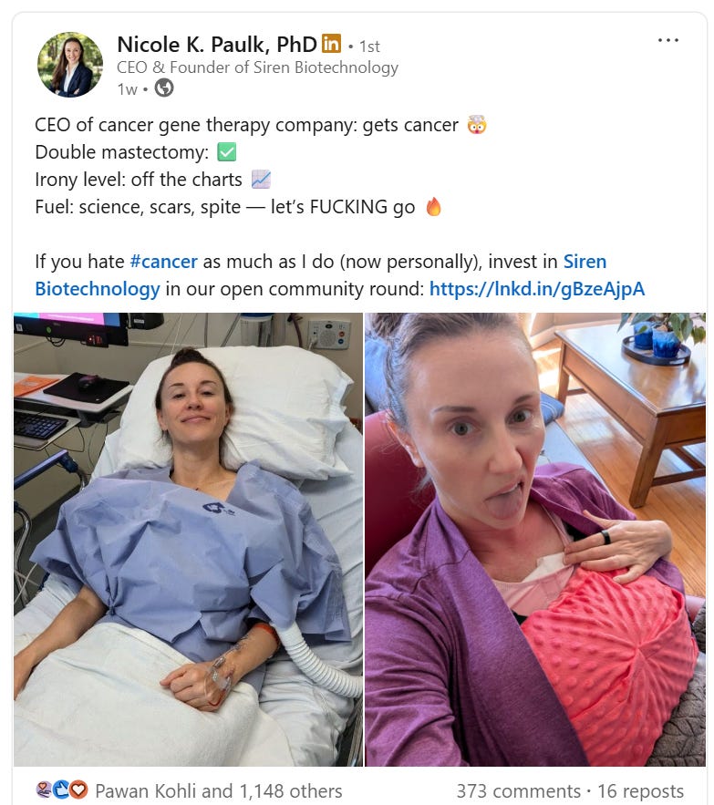 Because in the very last week of her Wefunder round, Nicole posted on LinkedIn that she, herself, had been diagnosed with cancer.