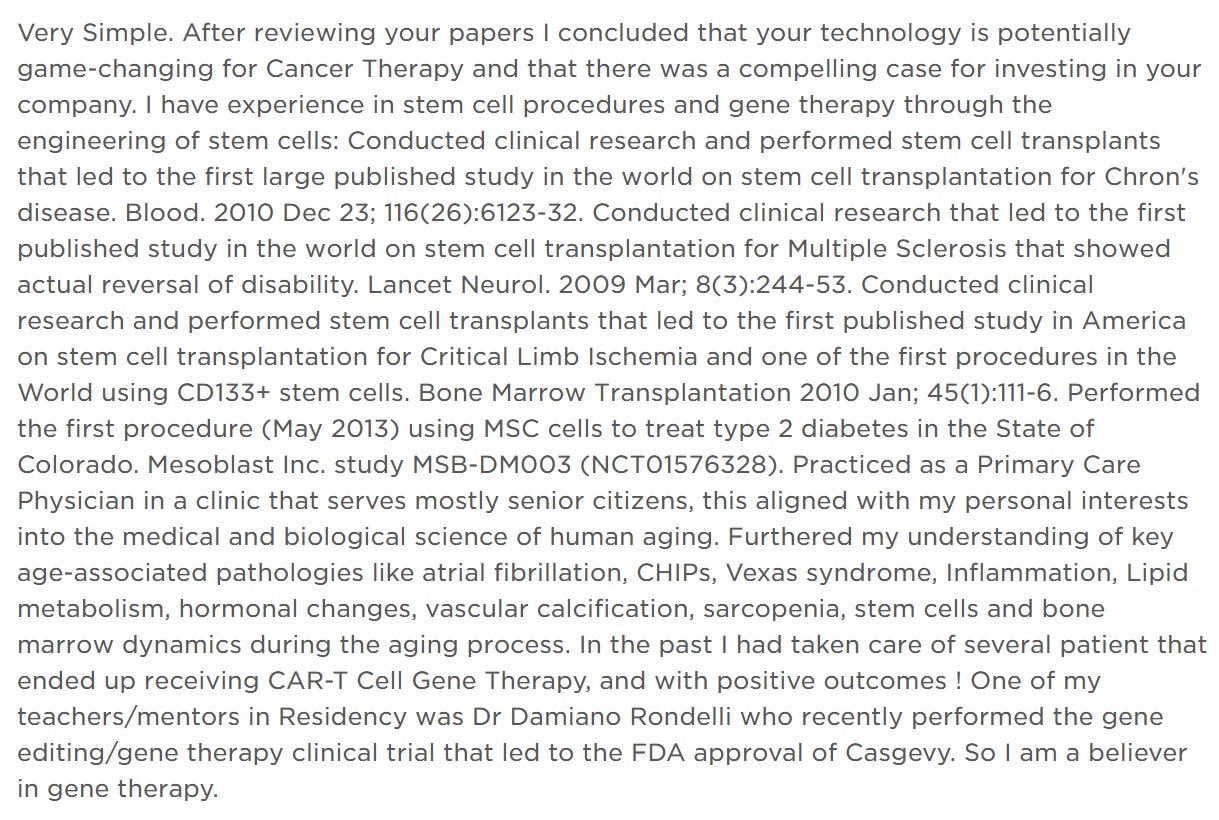 But Founders Fund is a pretty legit VC to have on your cap table. And this guy seems smart. Both an MD and a PhD with experience in stem cell transplants, here’s his investor note from when he invested in Siren last week: