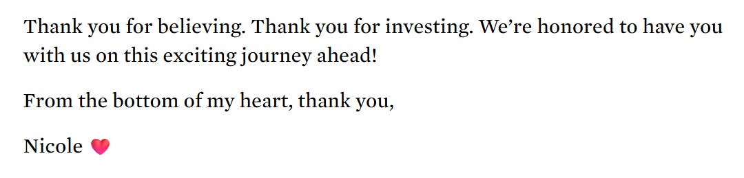 To quote directly from the investor update that Nicole wrote in the days after their community round concluded: